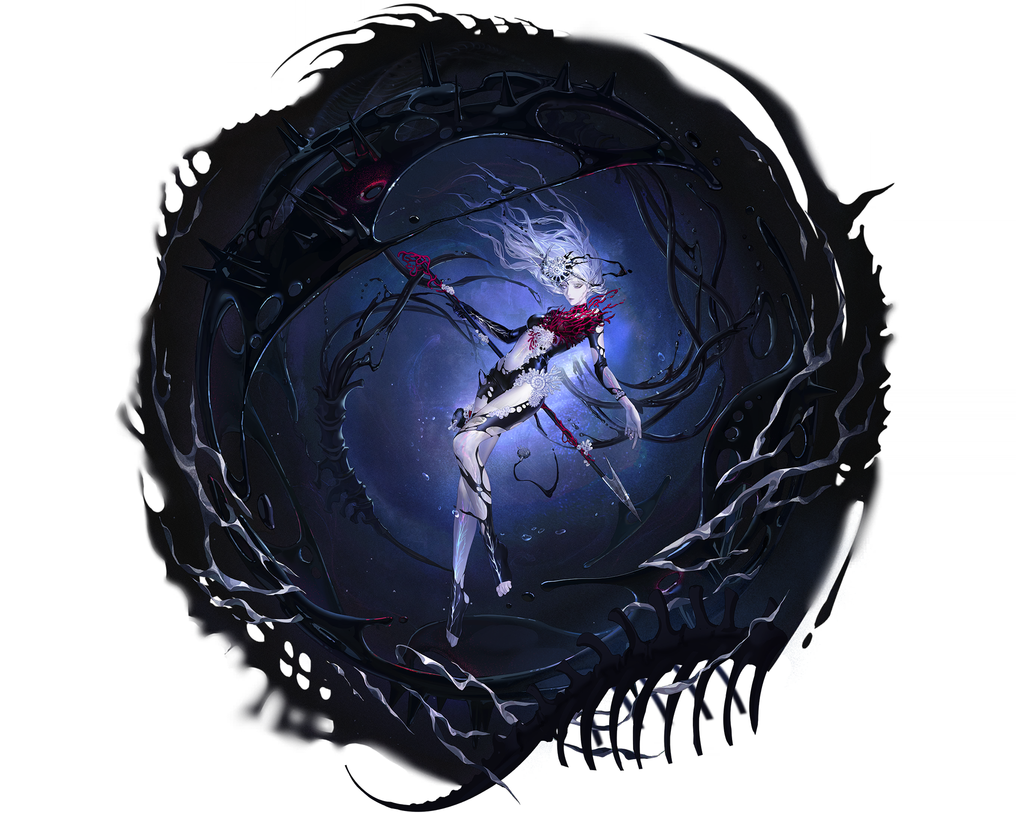 Pylgia's corruption is mostly stable, though her body displays severe mutations similar to that of a corruptor. The long, mutated appendages and regenerating barnacles have put other Sinners and Staff on edge... and, unfortunately, her tendency to move quietly and not speak has created a series of 'jump-scare' incidents where Pylgia is said to "suddenly appear" in dark corners of the Bureau. In reality, she's simply seeking solitude and refuge from the high degrees of stimulation, and is unable to verbalize an apology whenever these events occur. She always apologizes to Chief for the trouble, later.Pylgia's power itself isn't too terribly hard to control with the holographic system. Most of her ability relates to her physical powers, between her harpoon and the mania-gown appendages and life forms sprouting at her will... Without her physical body, and physical weapon, its difficult for her to manifest any of these other than visual effects on her person. If her body is ever recovered, this risk will need to be reassessed.Aside from scaring others with her appearance, she can also cause a bit of a commotion when she's trying to protect someone from a threat that isn't there... Or, occasionally, misinterpreting human cues or behaving in animalistic ways. Not harmful at all, but still alarming to others and may need staff involvement.Pylgia is, unfortunately, highly sensitive to perceived rejections. Events in this theme may cause her to manifest additional corrupted limbs and/or visibly decomposing and translucent skin when overwhelmed and feeling out of place. This has yet to cause issues, but such incidents closely monitored as a precaution for further destabilization and danger.For her case, she's given access to bodies of water throughout the Bureau, and a "sensory deprivation tank" where she can rest and recuperate in "dark and silent water" that mimics the deep ocean. This is often enough to stabilize her mania and keep her from triggering a shut-down in her simulacrum projection.Since Pylgia self-regulates her own mania (seeking out the sensory tank whenever she feels overwhelmed) and often looks to the Chief for any and all guidance, restrictions have mostly been efforts to keep her from startling or panicking others (and to prevent their panic from degrading her condition).